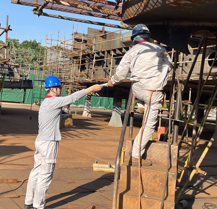 重吊船2#船自8月2日上船臺定位GB02總段,目前已經(jīng)合攏總段4只,總組完工7只,所有工作沒有因為高溫而暫停,進度沒有因為環(huán)境而滯后。同系列船,3#船和2#船的硬件設施不一樣,搭載方案不同,3#船采用小組段搭載,強化前期策劃,克服高溫惡劣天氣科學連續(xù)施工,底層合攏工作基本完成,下一步進行全船成形攻堅。